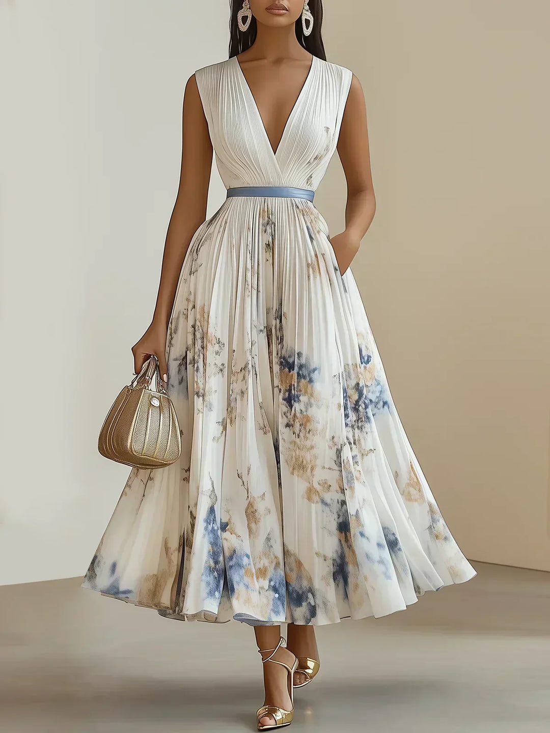 Judy | Bohemian Abstract V-Neck Pleated Midi Dress